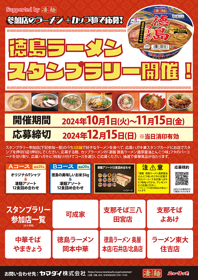「徳島ラーメン奥屋」では、本店、石井店、北島店の3店舗でスタンプの押印が可能です。スタンプは3店舗のうち、いずれか1店舗で押印されたもののみ有効となります。予めご了承ください。