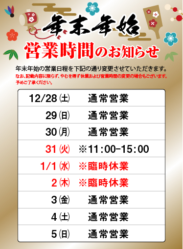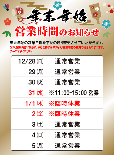※なお、記載内容に限らず、やむを得ず予告なく休業および営業時間を変更させていただく場合もございます事、予めご了承ください。