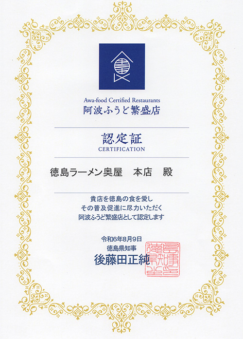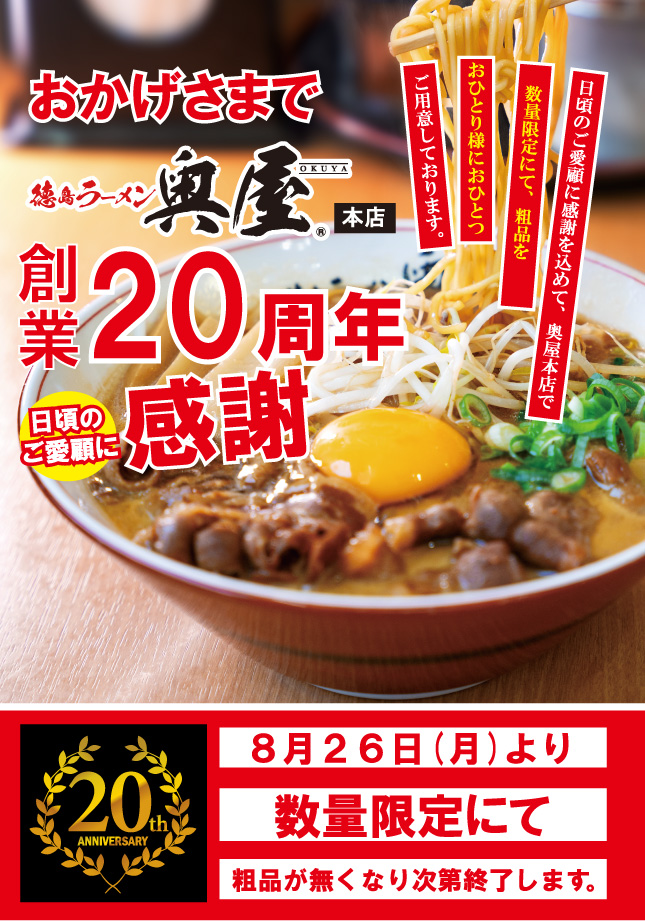 徳島ラーメン奥屋本店は2024年8月11日をもちまして、創業20周年を迎えることとなりました。